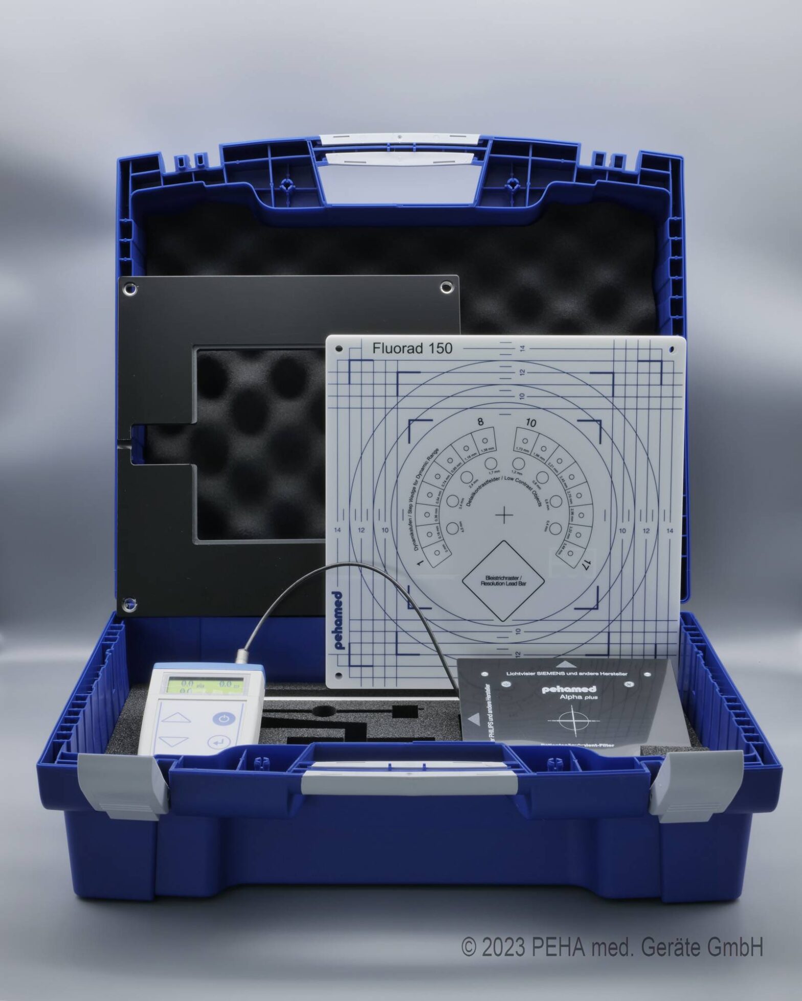 Package for constancy testing of digital X-ray and fluoroscopy systems according to DIN 6868/150, DIN 6868/4 and DIN 6868/157. Package includes: Fluorad 150 test phantom CD mon light meter Alpha plus dosemeter (basic unit) Detector in absorption filter Distance plate Form block for fluoroscopy systems Case “Heavy”