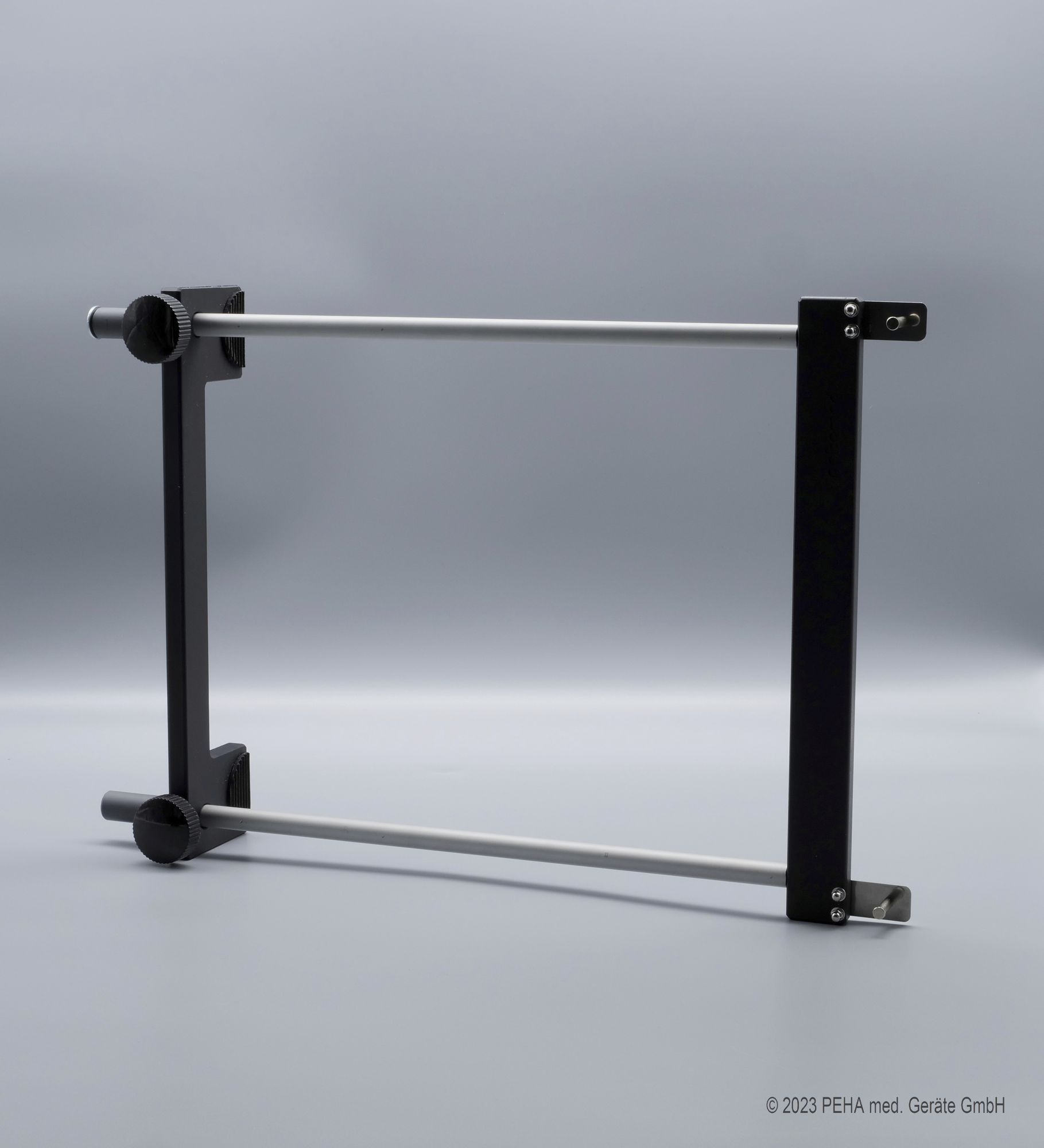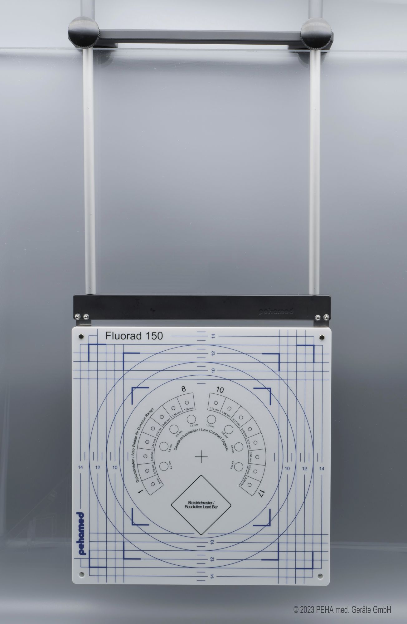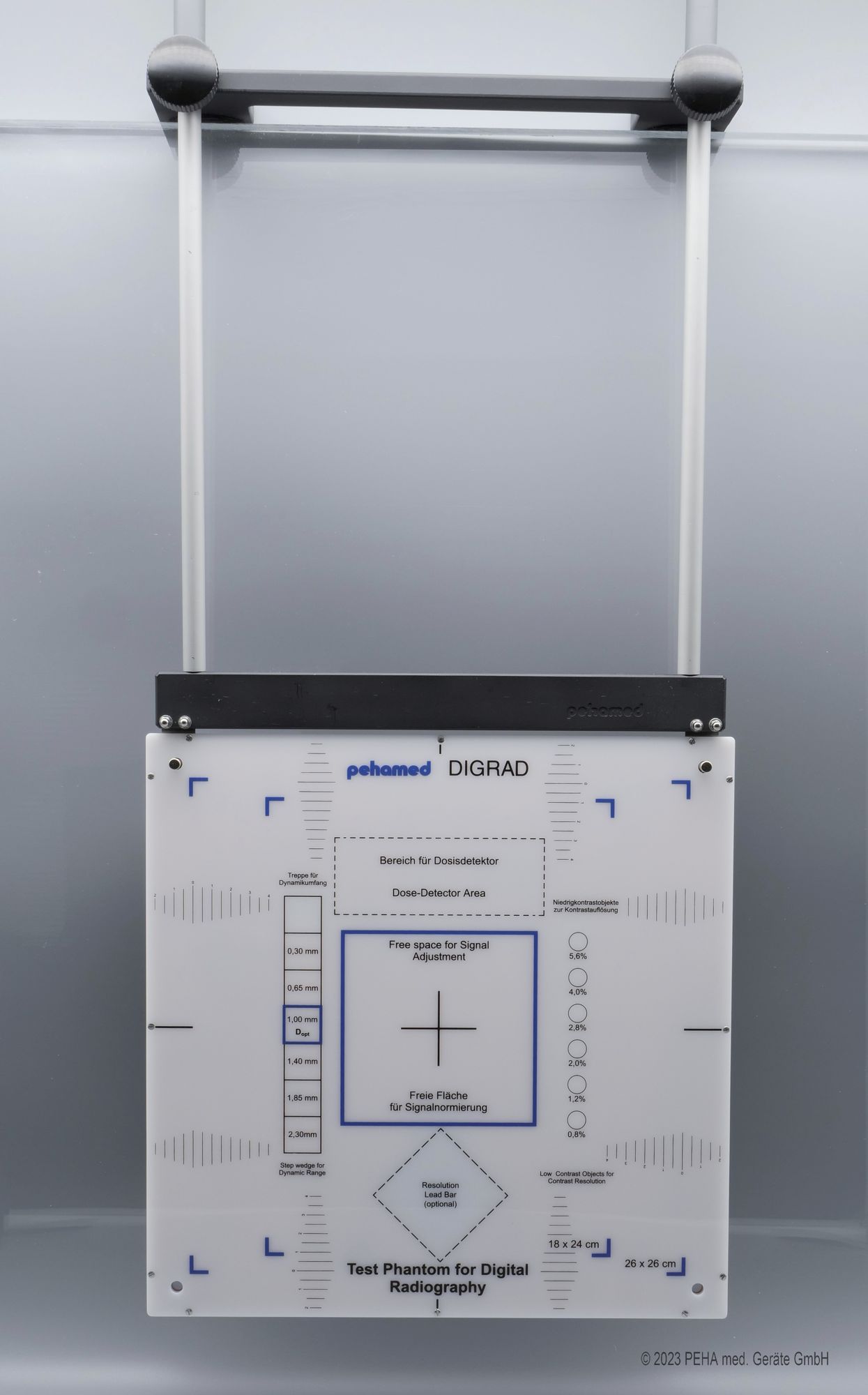 Phantom holder for the test phantoms Fluorad 150, Digrad A+K and Alpha for mounting on Bucky wall stands.